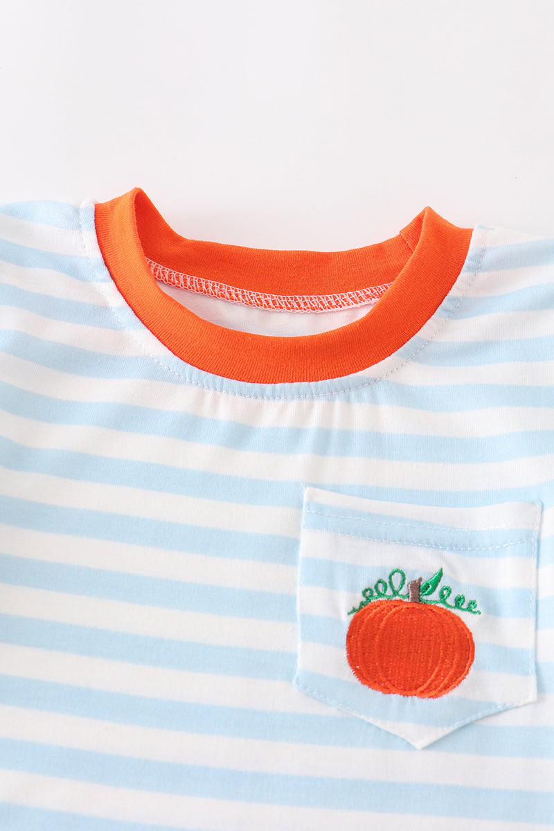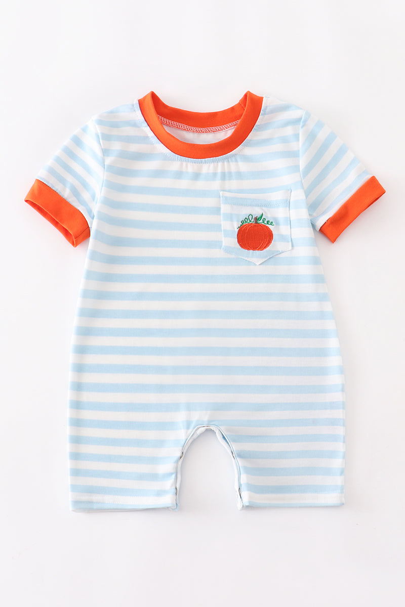 This is the perfect outfit for your little one this autumn season! With its charming blue stripes and adorable pumpkin embroidery, this romper is sure to capture hearts everywhere.