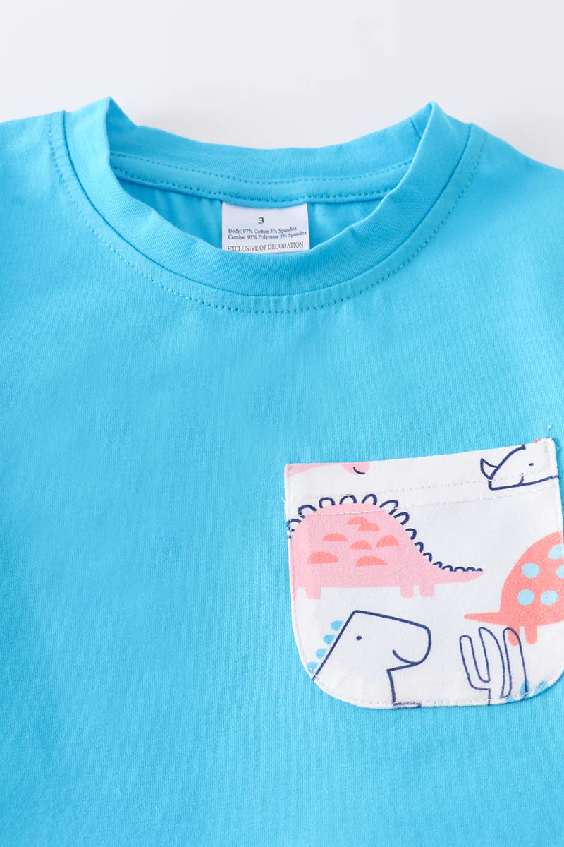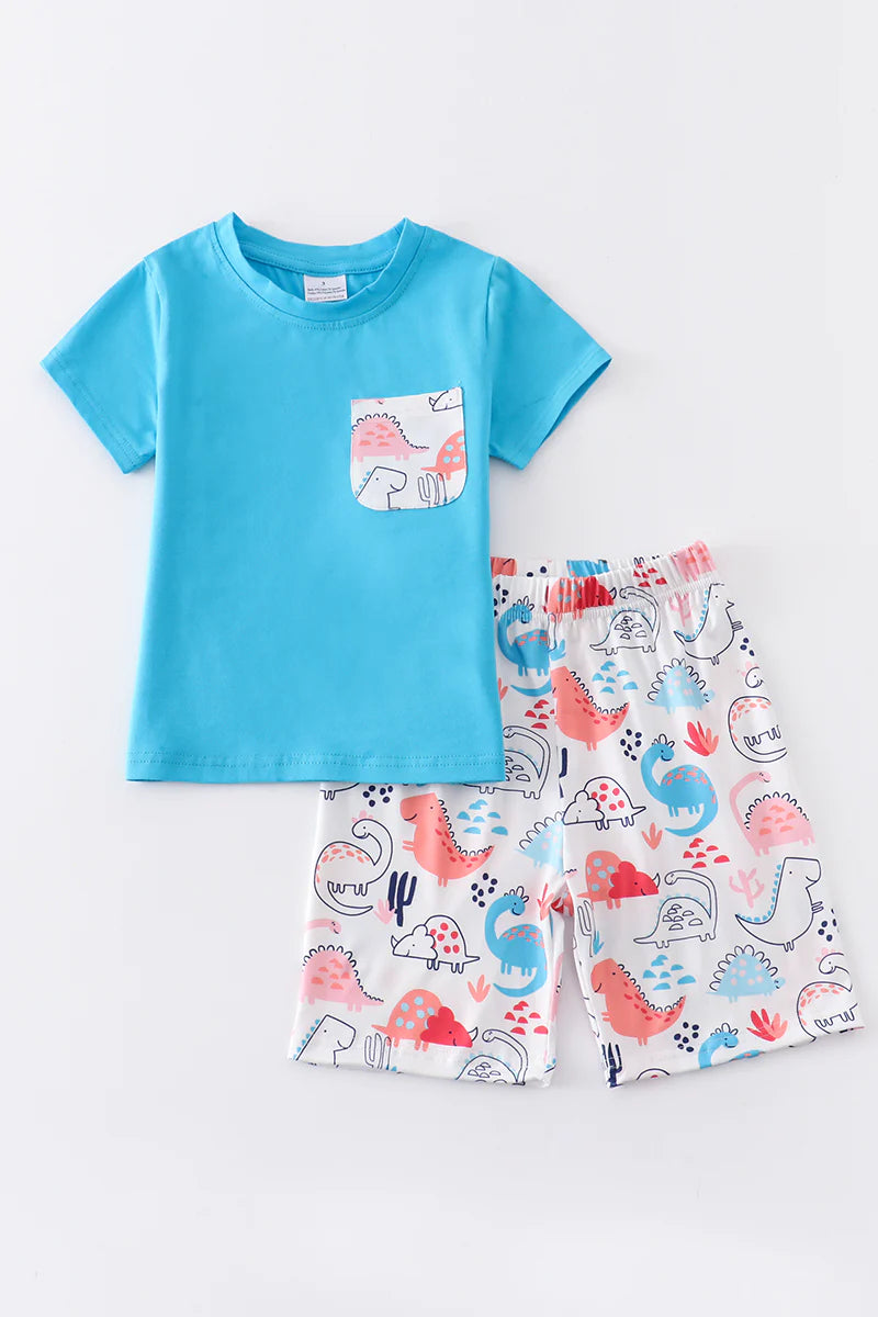 Introducing our adorable Dino Print Short Set, the perfect outfit for your little one this Spring and Summer! This set features a blue shirt with a charming dino pocket, making it a fun and stylish choice for boys who love dinosaurs.