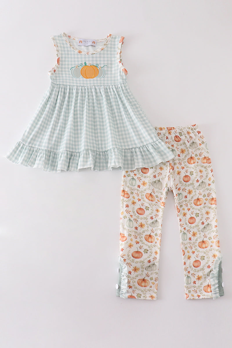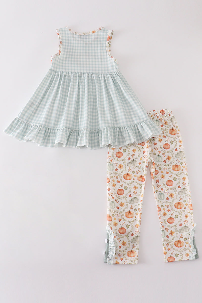 Half of this set features a charming green and white checked top that evokes the essence of Fall. Its crisp, seasonal colors are ideal for capturing that festive spirit. Adding a touch of elegance, the pants feature a beautiful lace accent, elevating this outfit to a new level of sophistication.