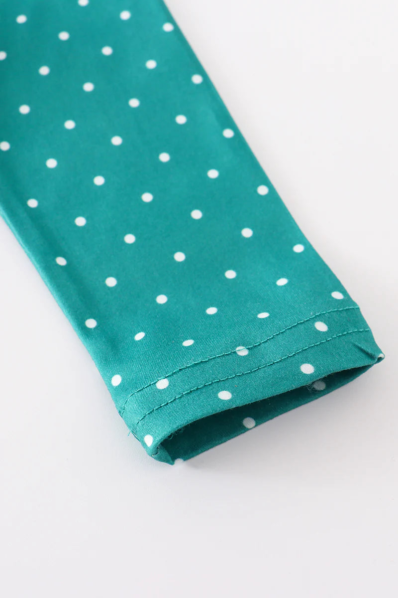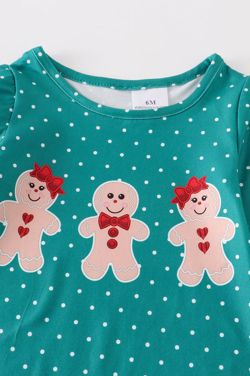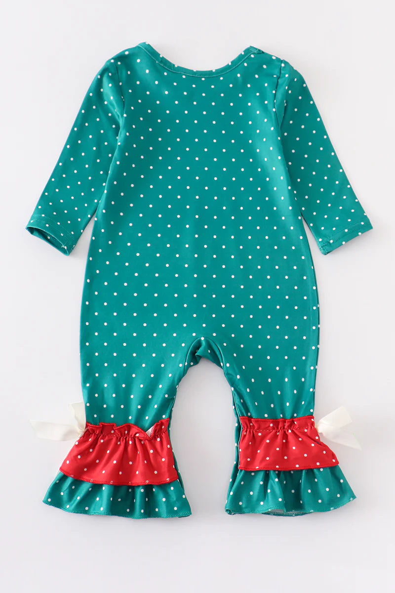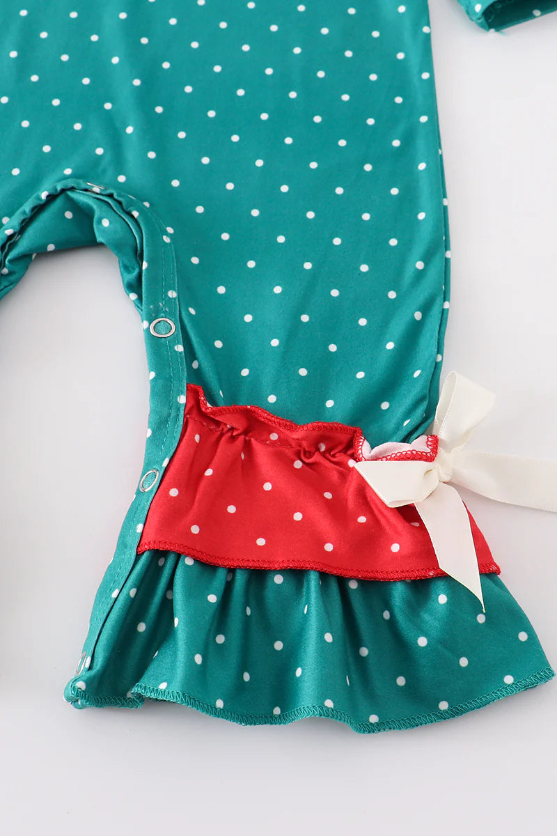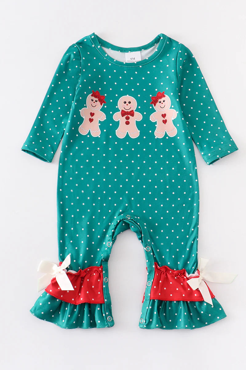 This gingerbread romper features a trio that almost look good enough to eat. :) The ruffle pants are given just the right pizzazz with the contrasting red and darling little bows.