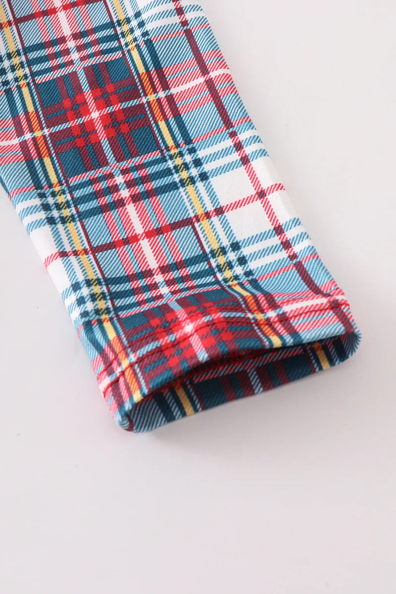 There is something almost vintage looking about this dress...and we love it! The Christmas plaid is a beautiful choice complimented so well by the light grey on the bodice. The Santa is the perfect addition to add a little extra jolly to this darling little dress.
