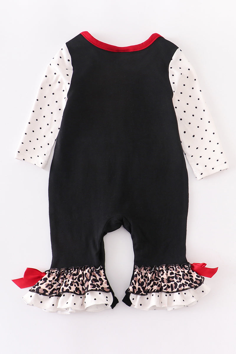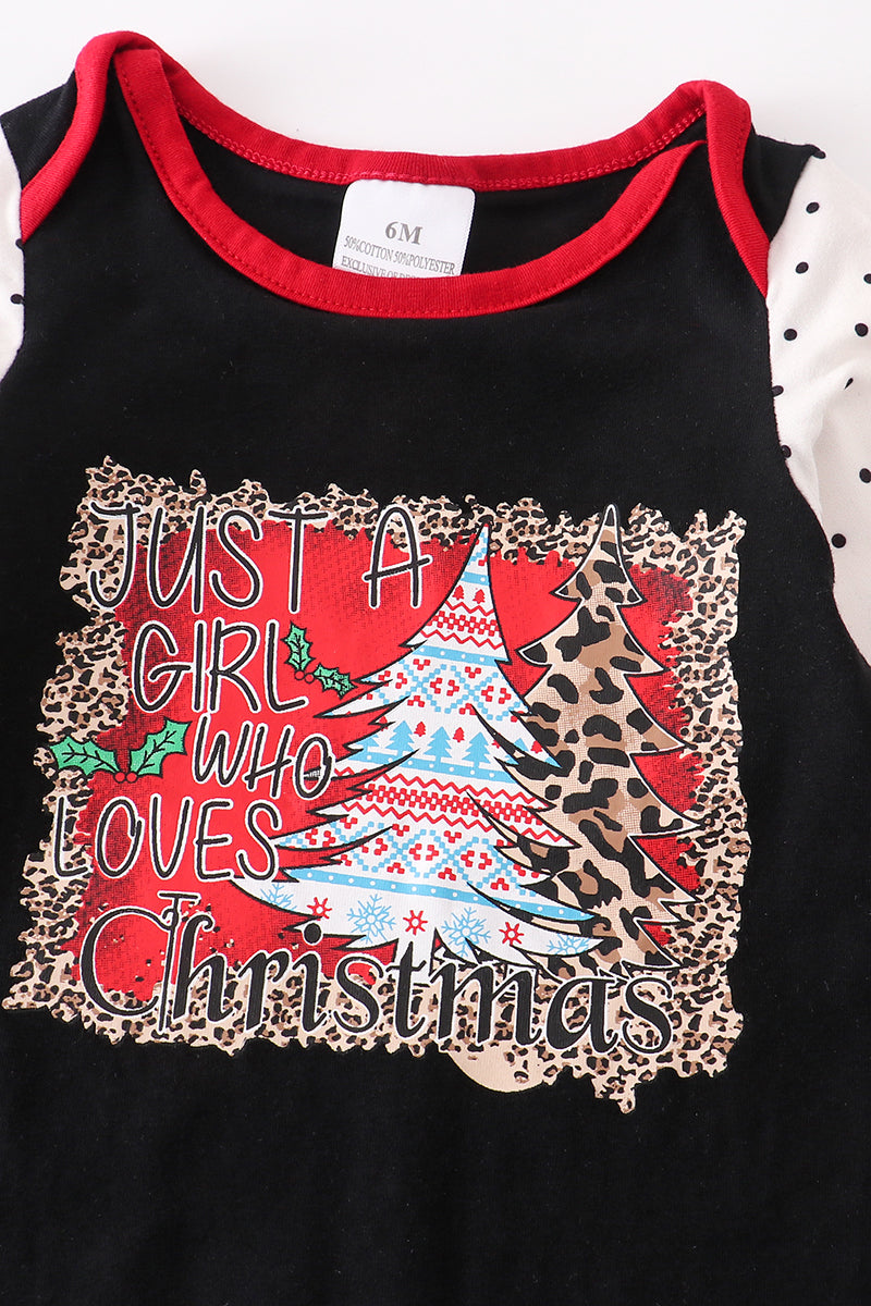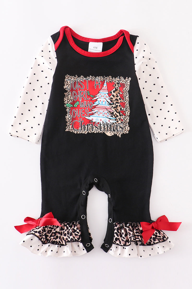 Featuring a delightful combination of Christmas trees, polka dots, and leopard print, this romper is a whimsical blend of holiday cheer and playful style. The vibrant colors and charming patterns make it a standout choice for any Christmas gathering or family photo session.