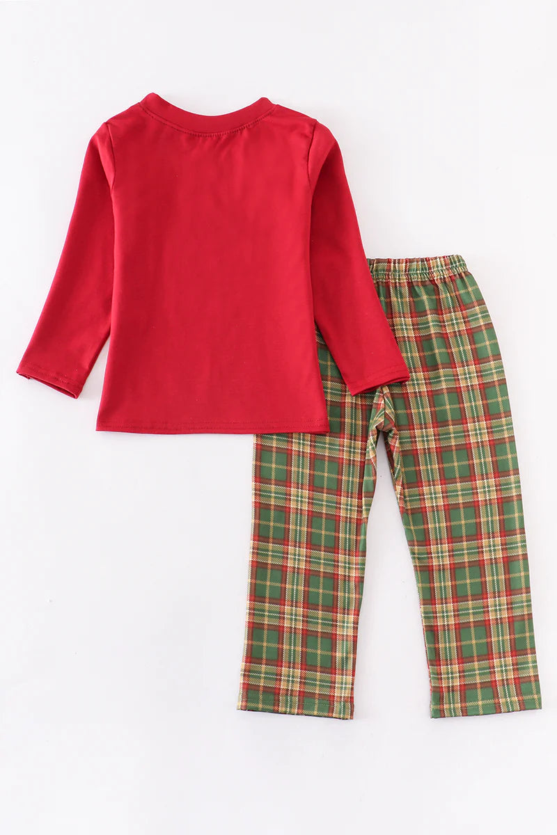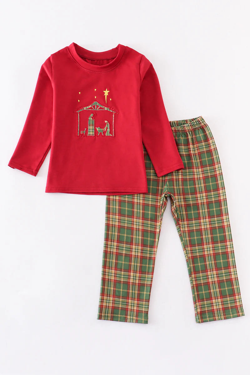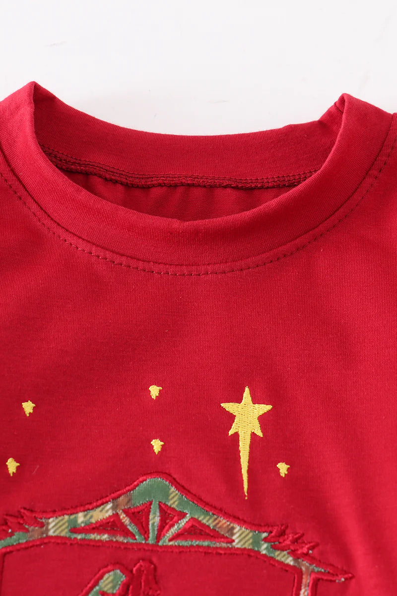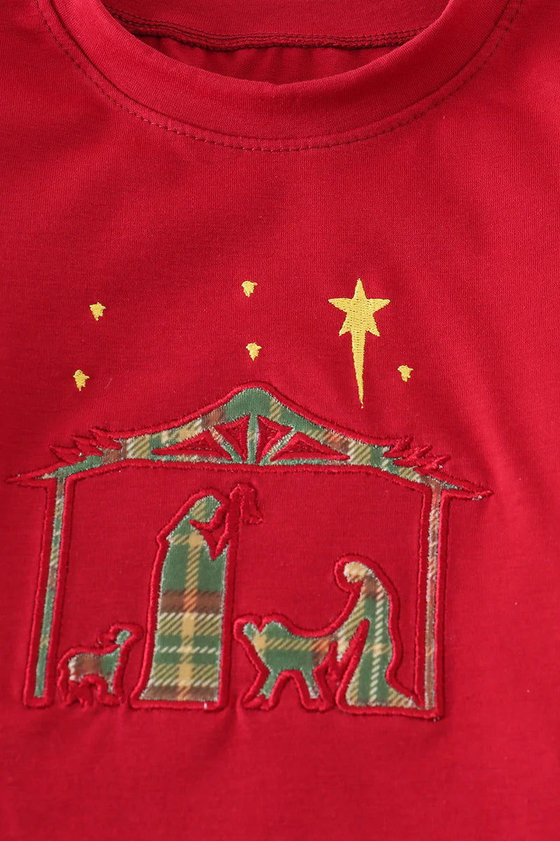 A gentle reminder of the Reason for the season. This maroon shirt, complete with the nativity applique, pairs so well with the Christmas plaid pants making this a favorite for this year's Christmas wardrobe.