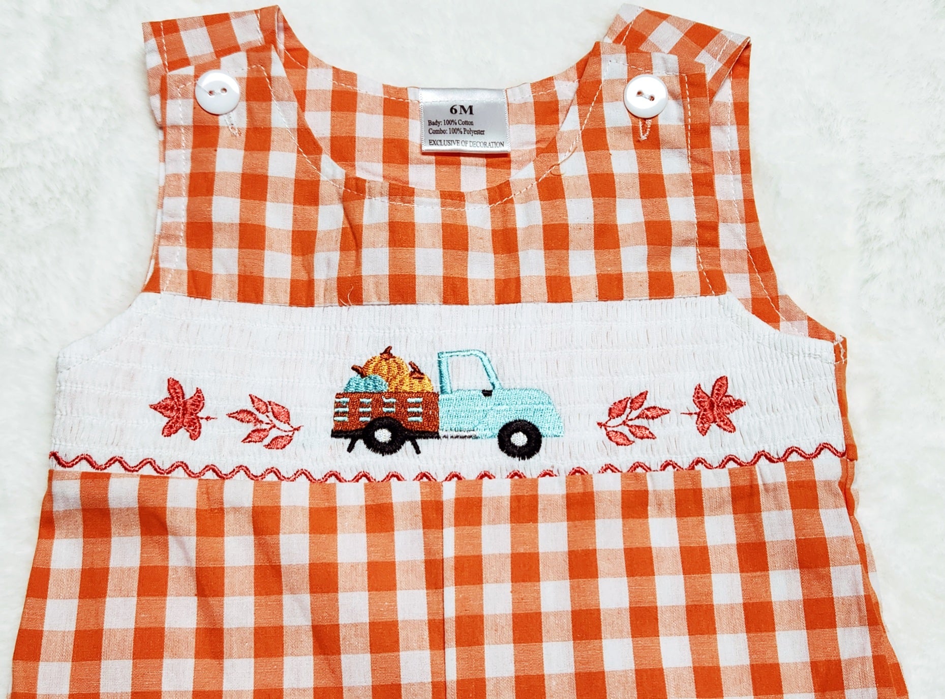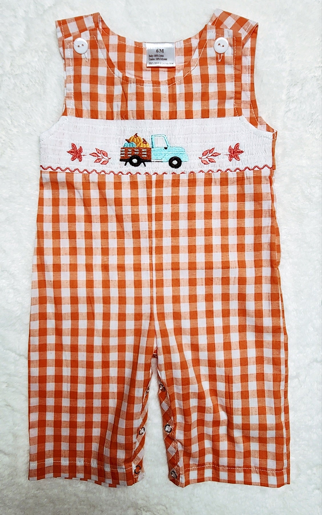 Introducing our adorable Orange Plaid Pumpkin Truck JonJon, the perfect outfit for your little one this fall!