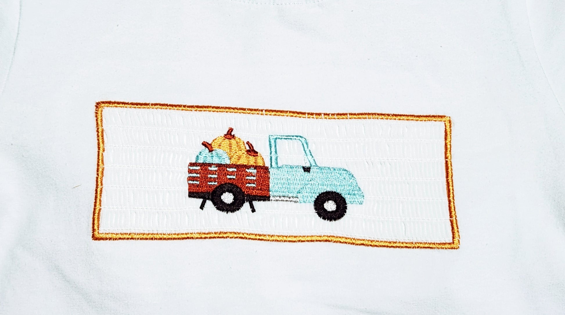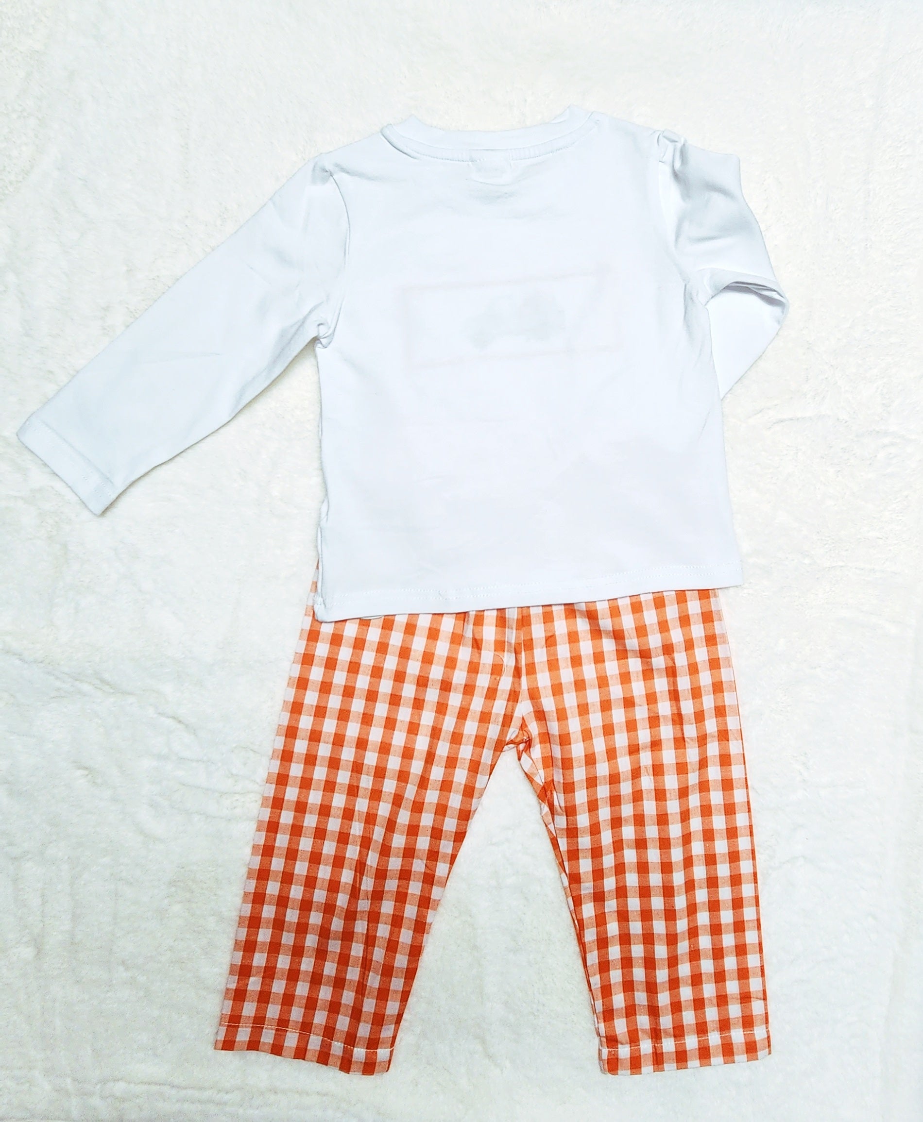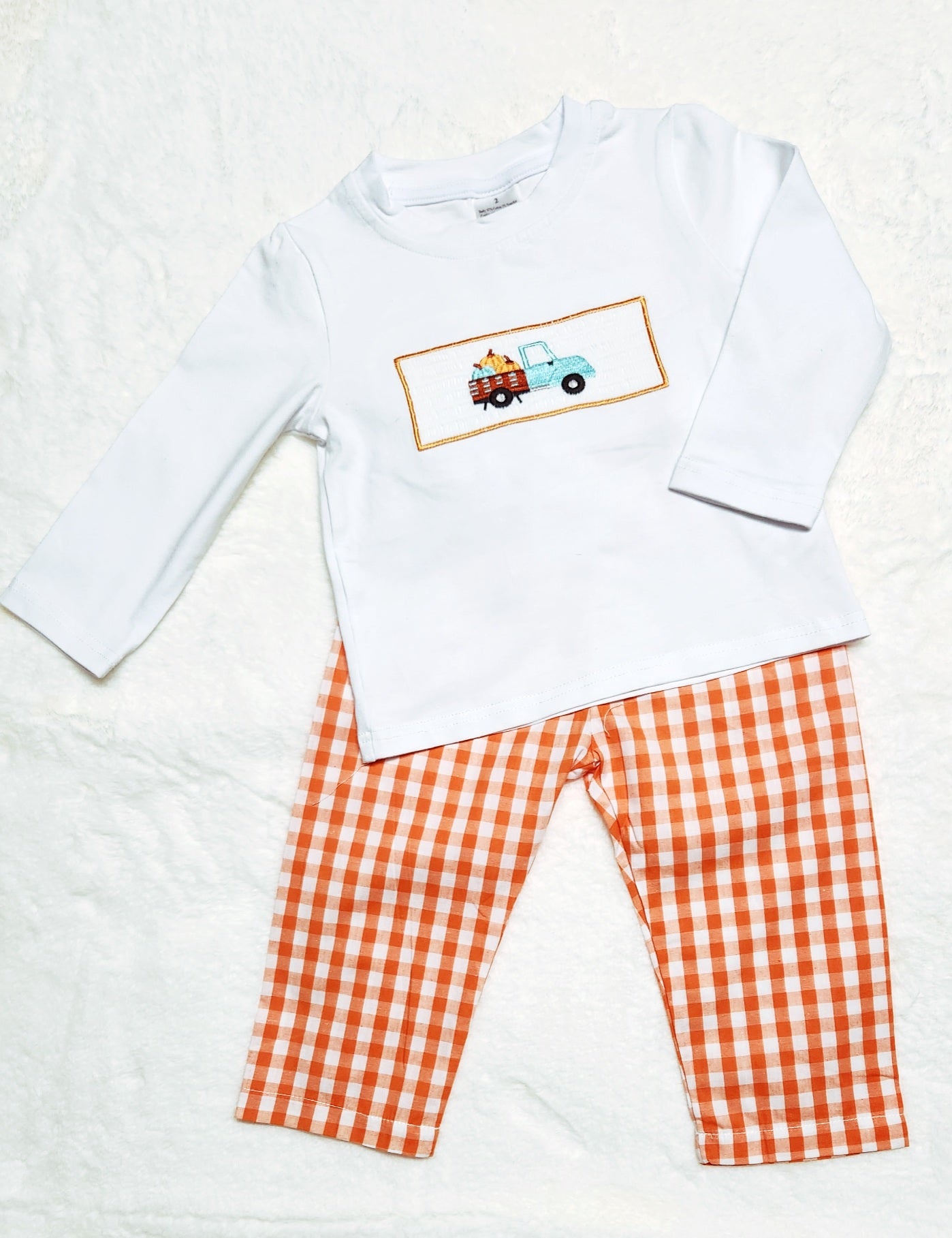 The centerpiece of this ensemble is a delightful truck design adorned with vibrant pumpkins, capturing the essence of the season in style. Crafted with utmost care and attention to detail, this set features a trendy orange plaid pattern that adds a touch of rustic charm. The soft and comfortable fabric ensures that your little one can move freely and play to their heart's content.